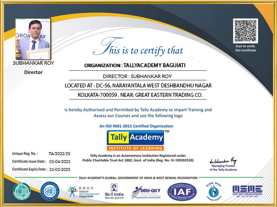 Established in 2005, Tally Academy, India’s one of the most Reputed & Renowned Skill and Talent Development Brand, Tally Academy is an Autonomous Institution Registered Under Public Charitable Trust Act 1882,Govt. of India ( Reg. No. IV-190302550) is also Society Registered (Reg. No. S/2L/47695) W. B. Act XXVI of 1961 .